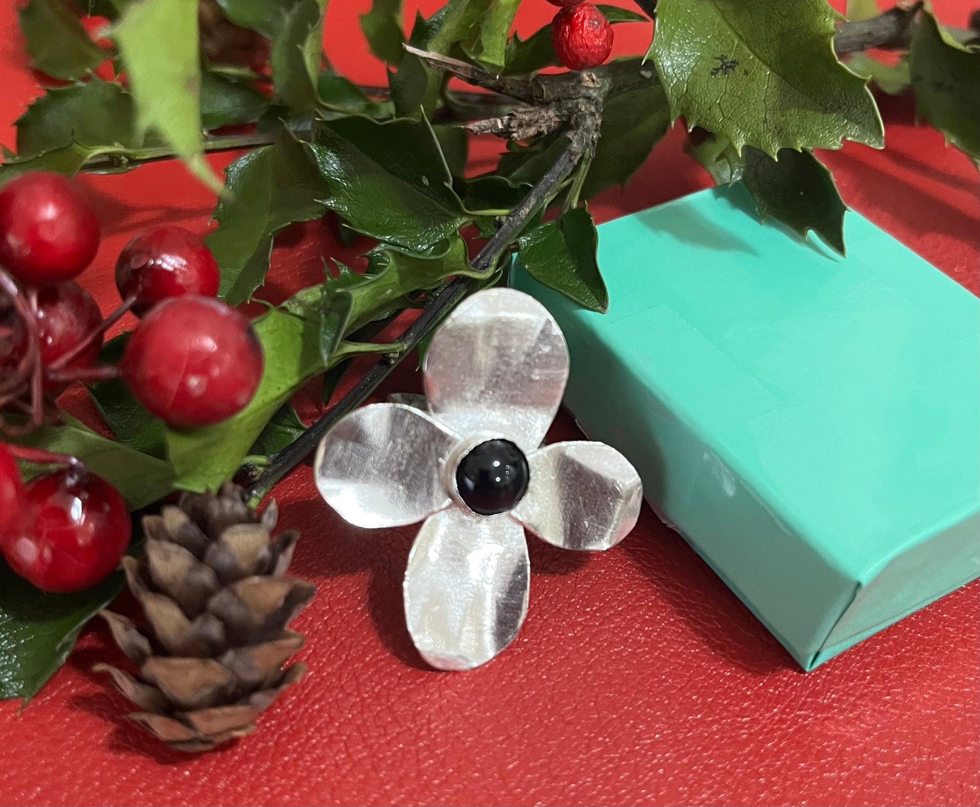 Onyx called the stone of strength. This sterling flower ring with 6mm onyx stone is a perfect gift. A statement ring, cocktail ring vibe, and party fashionable. Hammered pattern band 1/4 inch width, ring size 6.25. handcrafted, comfortable feel and very pretty.